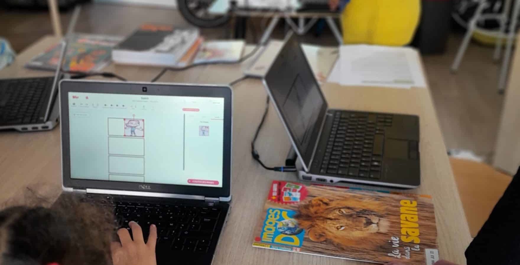 Les enfants ont utilisé l’application BDnF, proposée par la Bibliothèque Nationale de France afin de créer des courtes bandes dessinées en quatre cases. Ce format de BD est inspiré d’histoires d’origines japonaises, le plus souvent comiques appelées YONKOMA. Les enfants ont pu expérimenter cet outil sur des ordinateurs et également dessiner sur des feuilles de papiers préparées à cet effet. Cette application est facile d’utilisation et permet aux plus jeunes de se lancer dans la création de séquences narratives sans même avoir de base en dessin. Proposé lors d’un atelier en classe avec l’école du Parc à Fontenay-aux-Roses, cet atelier s’est déroulé grâce à un partenariat avec BD Pop, le volet scolaire du festival de BD de Montréal.